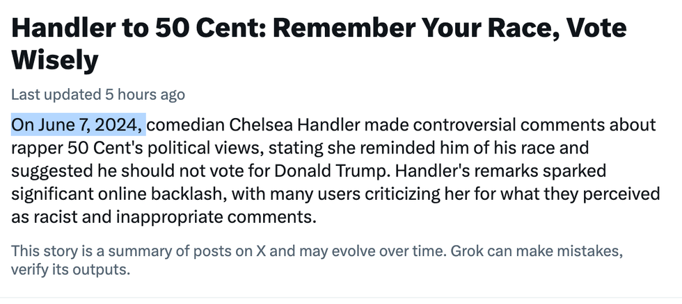 Then someone clipped this segment from a four year old Jimmy Fallon interview, making it look like Handler was responding to 50 Cent kicking it with Republicans in 2024. "I had to remind him that he was a black person so he can't vote for Donald Trump, and that he shouldn't be influencing an entire swath of people who may listen to him because he's worried about his own personal pocketbook. ... If he changes his mind and publicly denounces Donald Trump, I might be willing to go for another spin, if you know what I'm talking about."