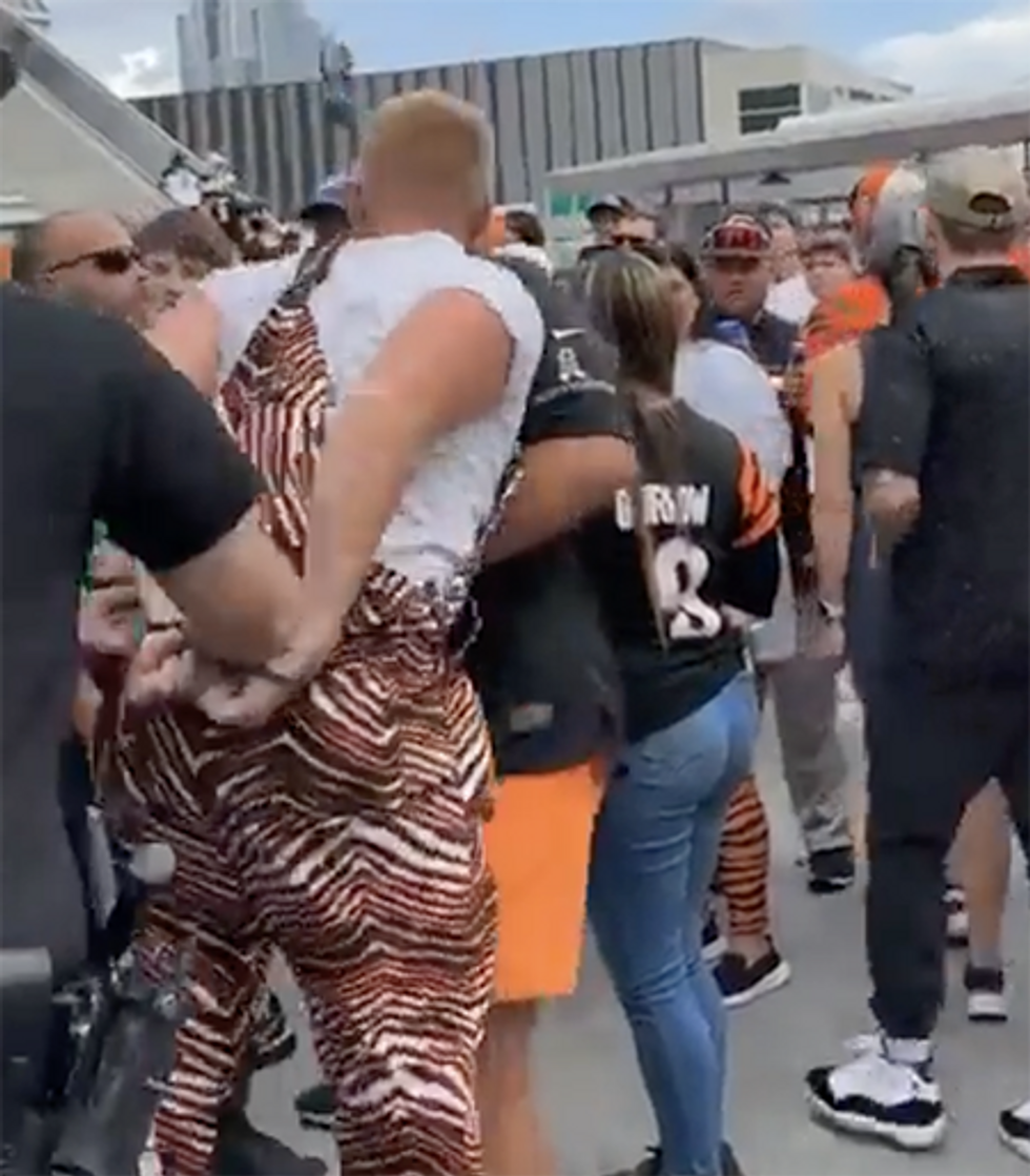 The Cincinnati Bengals are 0-2. Ja'Marr Chase was my first-round draft pick. You can understand this guy's frustration. Regretful decisions get made in the heat of passion. What's unclear is if Sunglasses staring at this guy is the reason Zubaz was getting handcuffed, or if the two incidents are unrelated and Zubaz was looking to fight everybody.