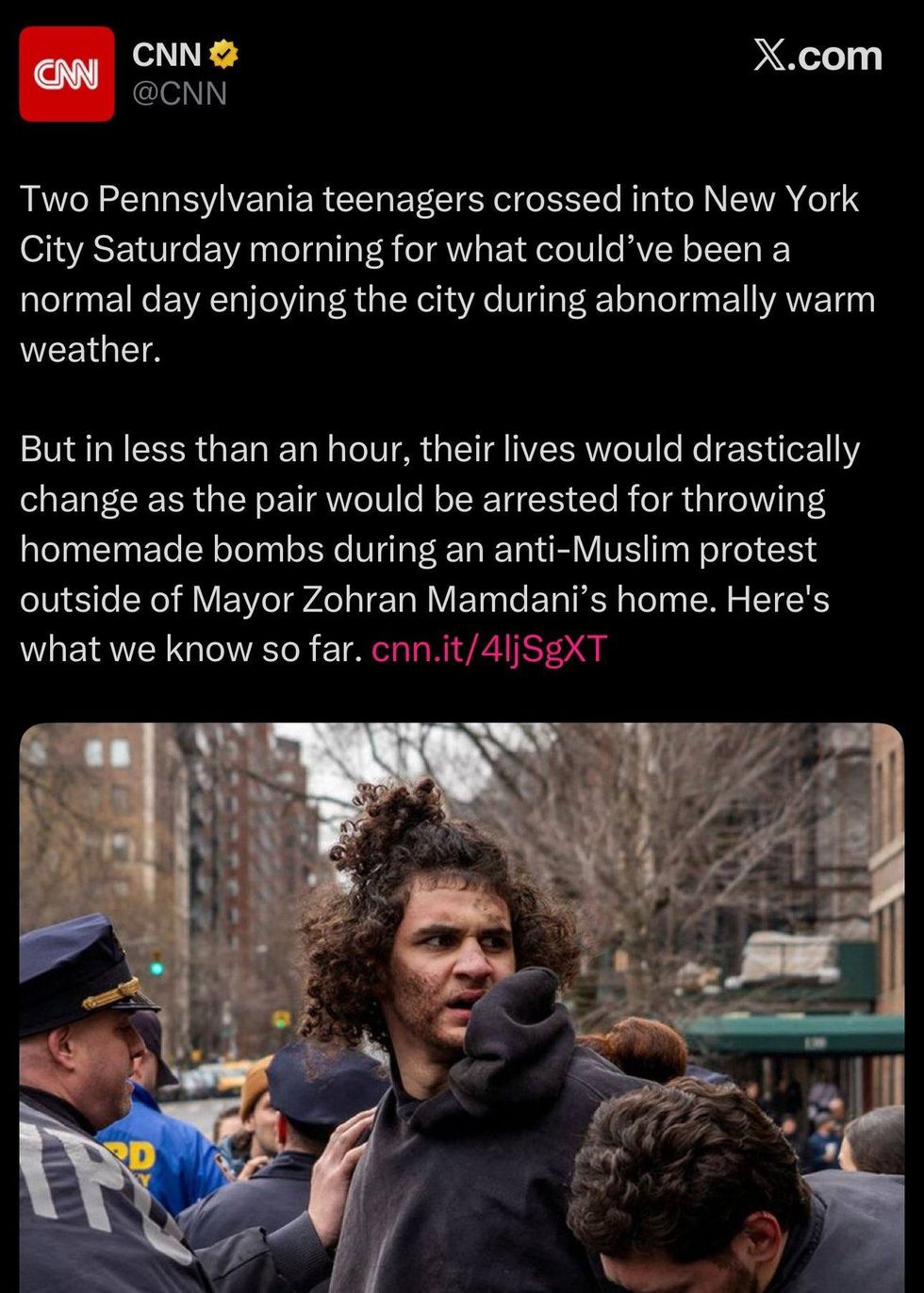A post regarding the two individuals arrested for throwing homemade bombs outside of New York City Mayor Zohran Mamdani’s home failed to reflect the gravity of the incident thereby breaching the editorial standards we require for all our reporting. It has therefore been deleted.