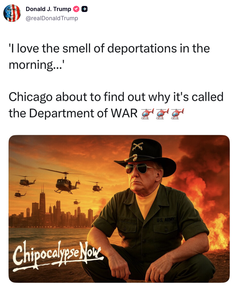 And then you have former ICE acting director Jonathan Fahey being all like: Your overreaction is funny. Also, no, Trump is not going to literally be dropping napalm in Chicago.