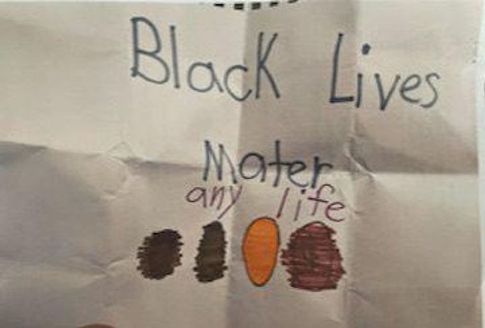 That's what Chelsea Boyle's daughter did at Viejo Elementary School in Mission Viejo, California. A RedState exclusive by Kira Davis reports, the first-grader--I'll repeat that for dramatic effect--the FIRST-GRADER drew a picture for her friend which included a handful of little faces colored in various colors and the phrase "Black Lives Mater [sic]." But she also included a little note that read, "any life." Someone call the Gestapo! We've got a kiddo here who thinks the lives of all her friends matter! How dare she cross the Black Lives Matter zealots!