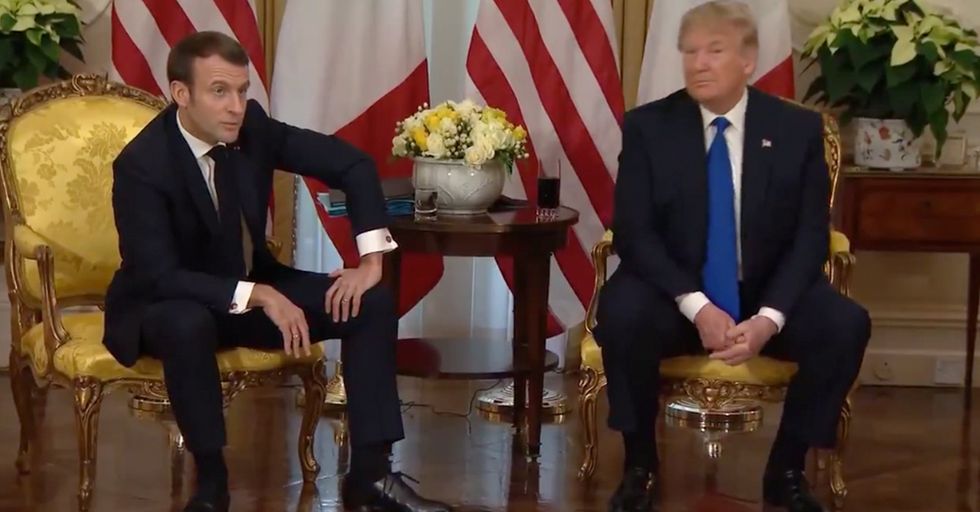 Donald Trump was elected partly because he talks trash about someone right out in the open. Not behind their back. Not just on Twitter or the comments on Facebook where hope goes to die. No, Donald Trump pokes fun at people just as those people claim to want it: right to their faces. So here is President Donald Trump, teasing President Macron about ISIS terrorists, saying "Did you want some nice terrorists?" then adds another zinger near the end. Watch, enjoy, then rewatch to catch Macron's bitch face.