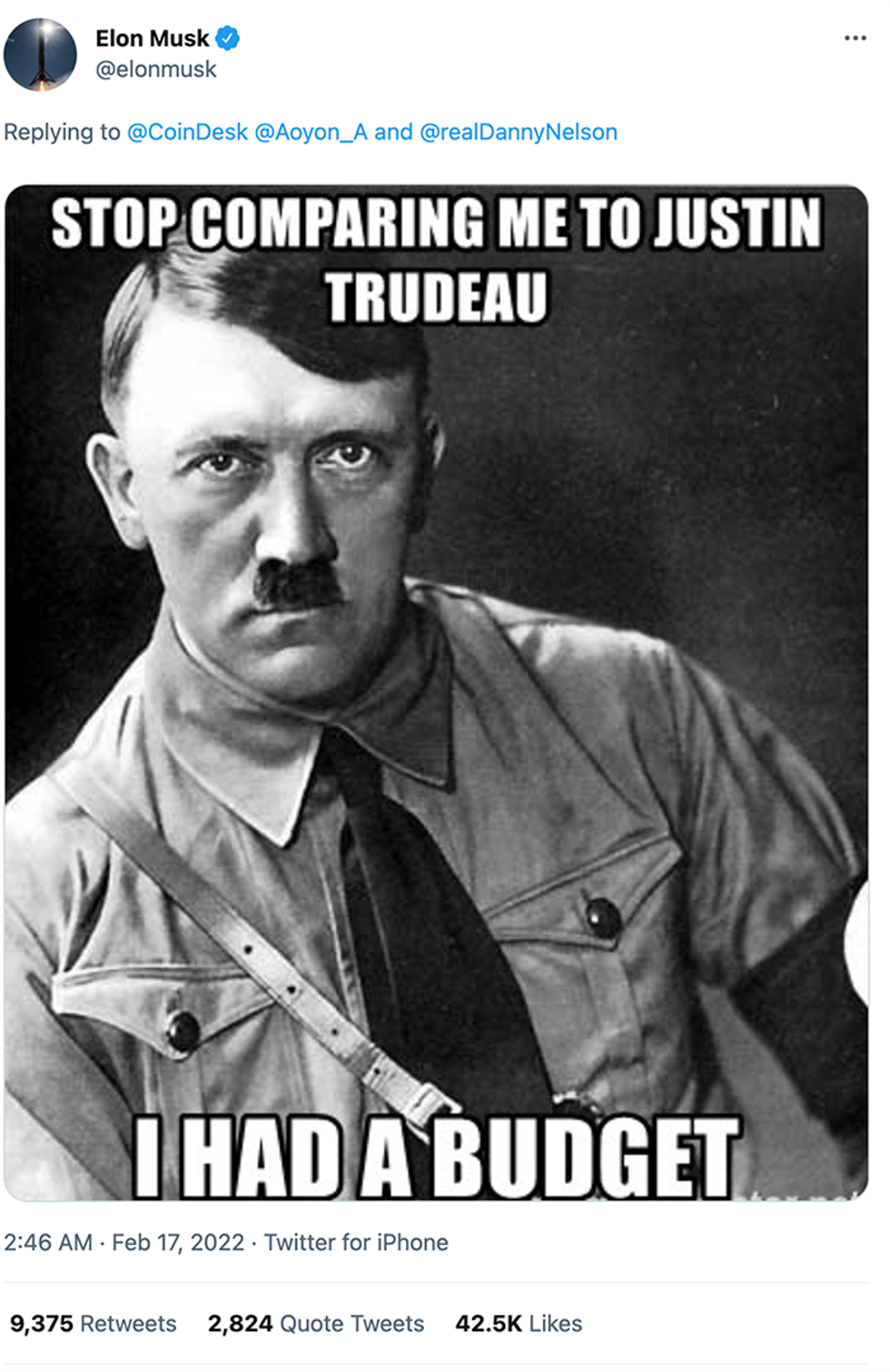 Comparing opponents to Hitler never works out how you think it will. Not that Musk is the first to do so. Plenty of others have said Trudeau at least sounds Hitler-adjacent. It's not something I choose to do. I prefer to mock Trudeau for being a little biyatch made of soy and hair goop. Others have a different opinion. There's only you and me and we just disagree and all that.