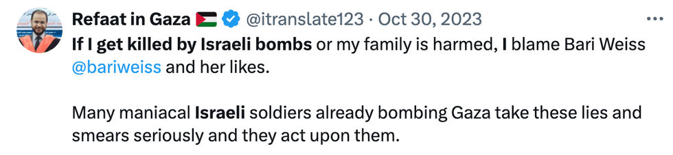 See, he tweeted about baking Jewish babies alive in an oven, and Weiss pointed out that he said so, so Alareer decided that if he ever got killed it would be Bari's fault.