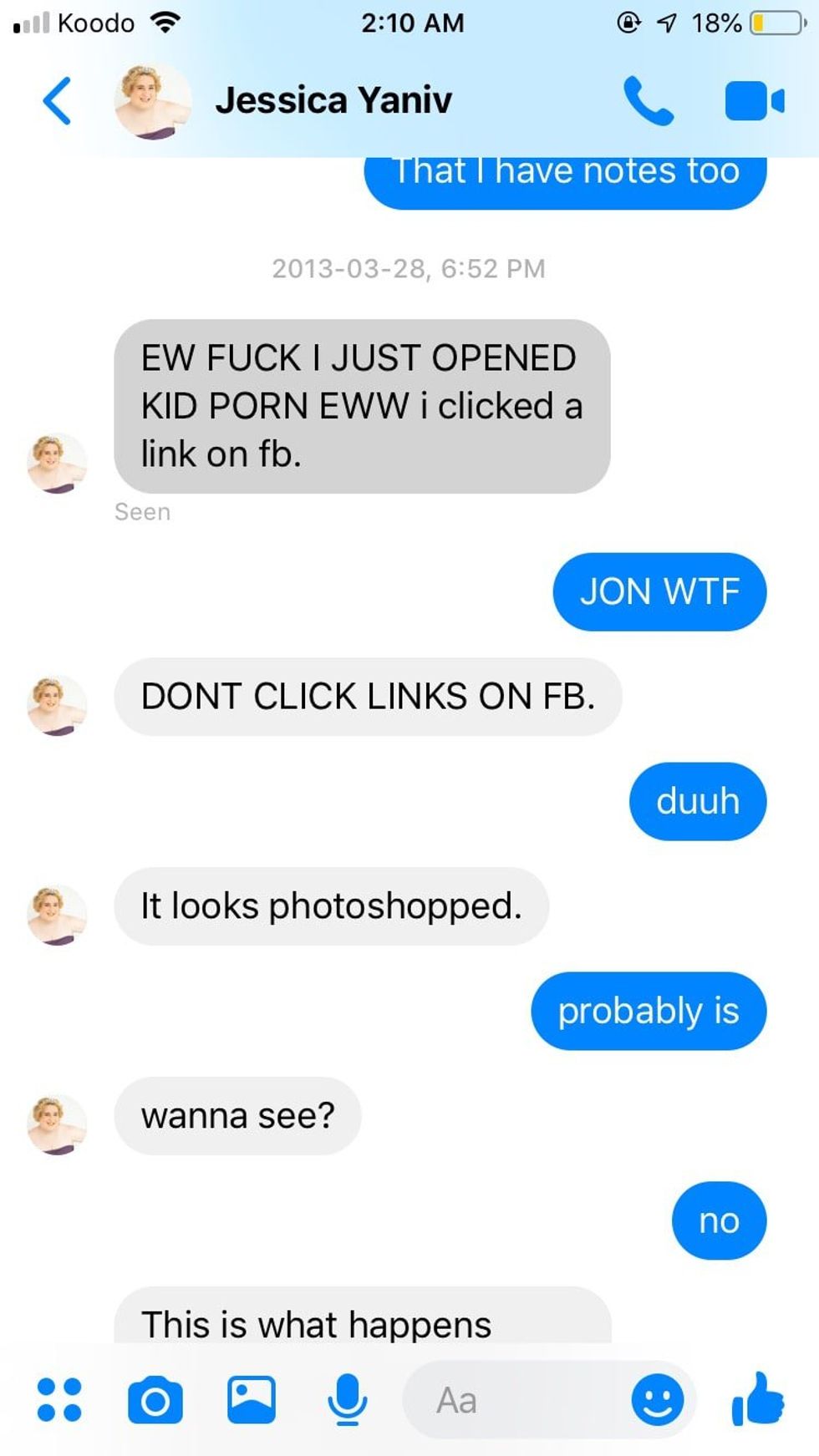 Many of the message exchanges between Yaniv and Ashley are freaking weird and might give you a strong case of the heebie jeebies. But the one where Yaniv tries to show Ashley child porn is probably the most substantially incriminating.