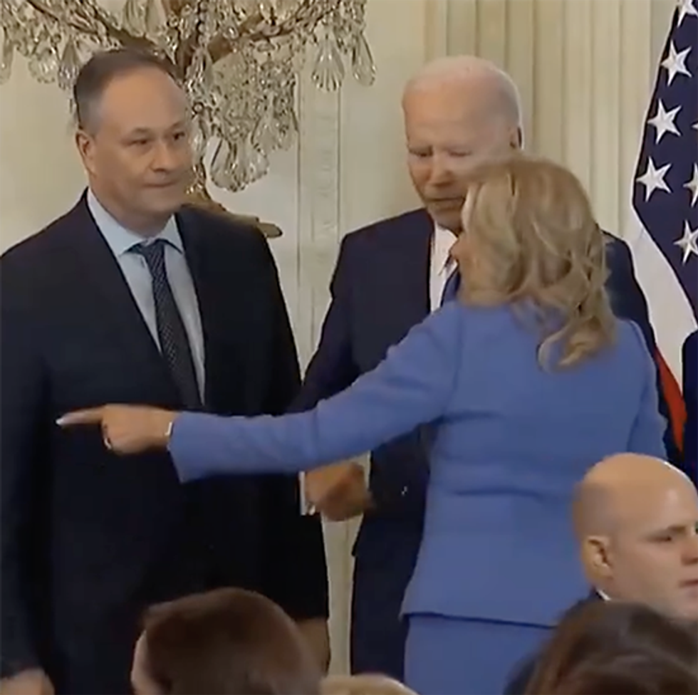 Then Jill Biden runs into the frame as if to say, "Joe, that's not me." Joe seems surprised.