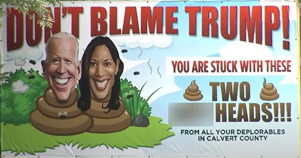 When discussing the Joe Biden administration, any number of synonyms for fecal matter comes to mind. Biden's border crisis has turned into a steaming dookie. Our president looks like a turd as he fumbles with his mask or attempts to speak in public. He constantly proves he doesn't know crap about guns. Just yesterday, we saw how his "stimulus" has dropped a giant deuce on the jobs market. All with Kamala Harris by his side as his number two. A group of Maryland "deplorables" has taken the sh!tty job Biden and Harris are doing literally with a billboard that is causing quite a brouhaha.