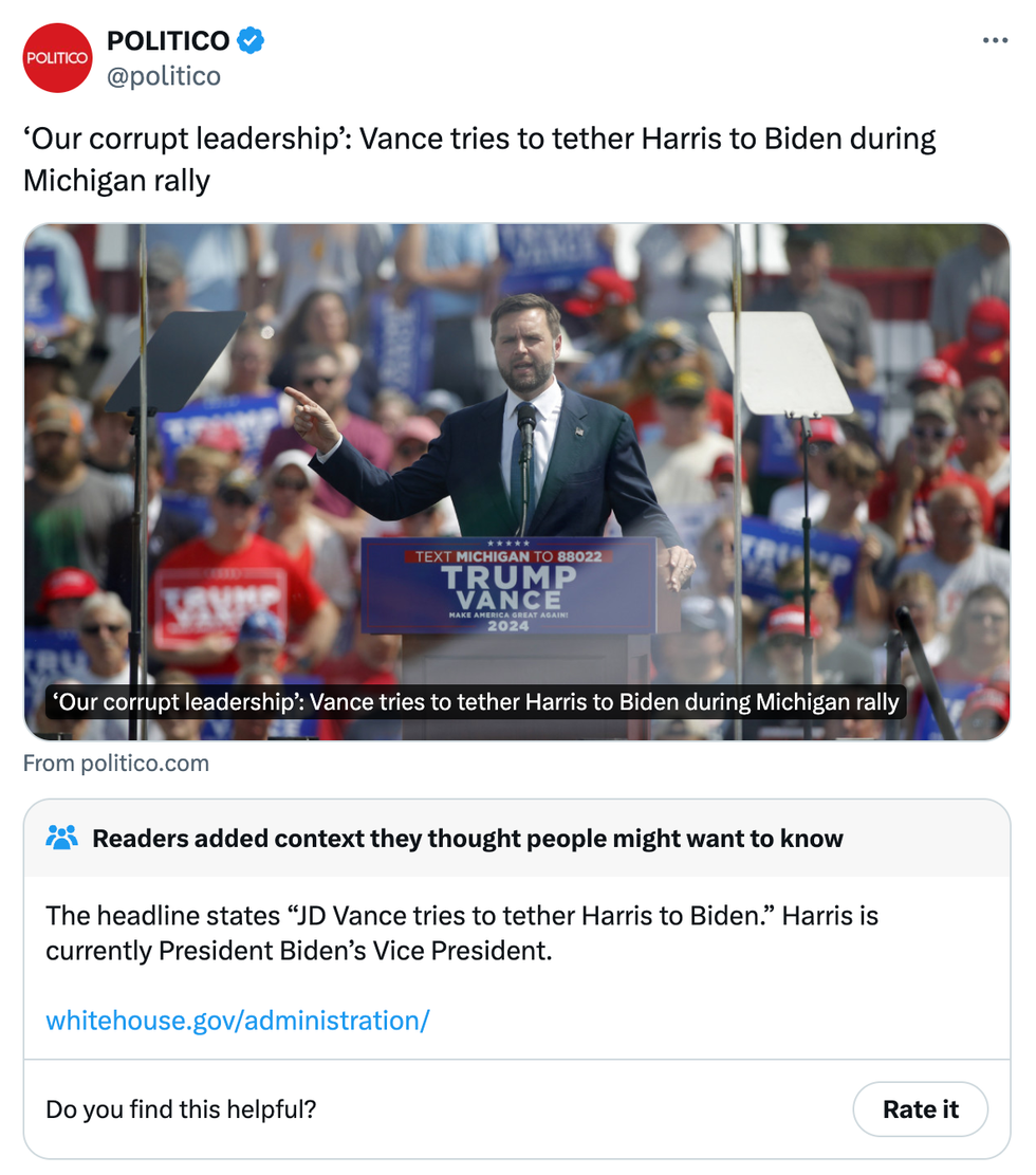 Community Notes comes to the rescue to point out, in case you didn't know, Kamala Harris is the "Harris" in "Biden-Harris Adminstration." Note in the thumbnail how the title of this article, when dropped on X, was ‘Our corrupt leadership’: Vance tries to tether Harris to Biden during Michigan rally.