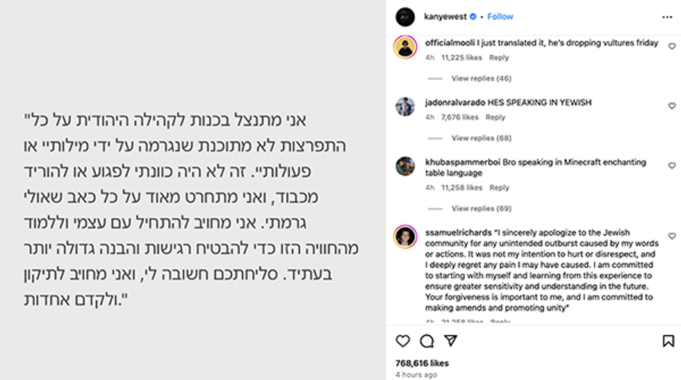 Kanye West apologizes to the Jews over past antisemitic outbursts, shares post written in Hebrew