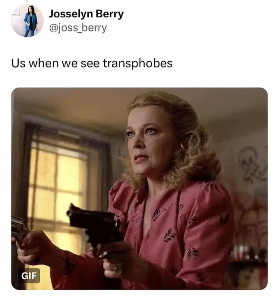 She was only fantasizing about people who have a different political opinion than her being murdered. She believes it's a-ok for minors to be chemically castrated and/or have their genitals mutilated. Anyone who disagrees is a -phobe.