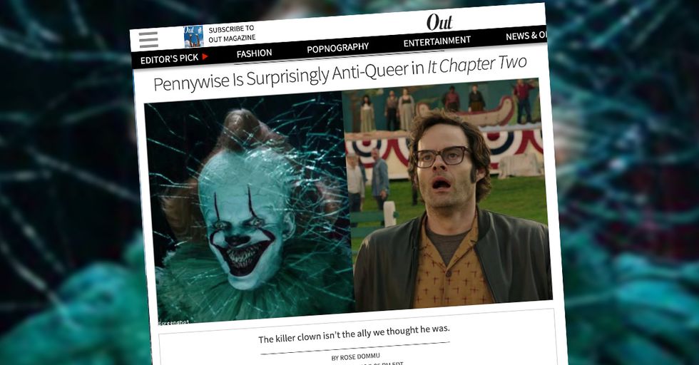Here I thought the left would be all upset their tenets are being used to make notorious villains. Thanos the rabid environmentalist anyone? But now at least one member of the LGBTQAAIP crowd is bitching about a killer clown not living up to her gay expectations. Perhaps Out wouldn't feel so threatened if Pennywise had simply baked a cake shaped like two penises crossed in love. Brave and beautiful love. Maybe if Pennywise had bludgeoned a straight couple using nothing but a dildo borrowed from a consenting lesbian, Out would've given It two penises up.