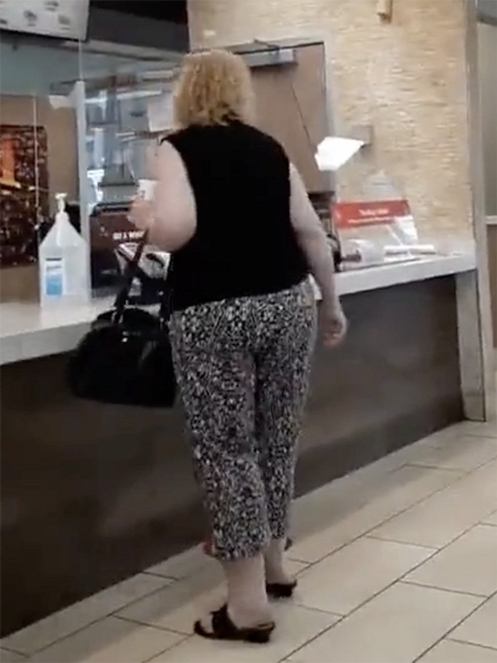 This specimen has all the traits of a Mask Karen. She claims she is concerned about her health. Yet she is ordering fast food and looks like this: