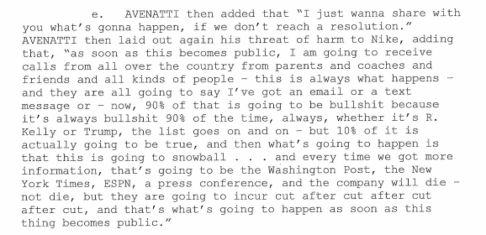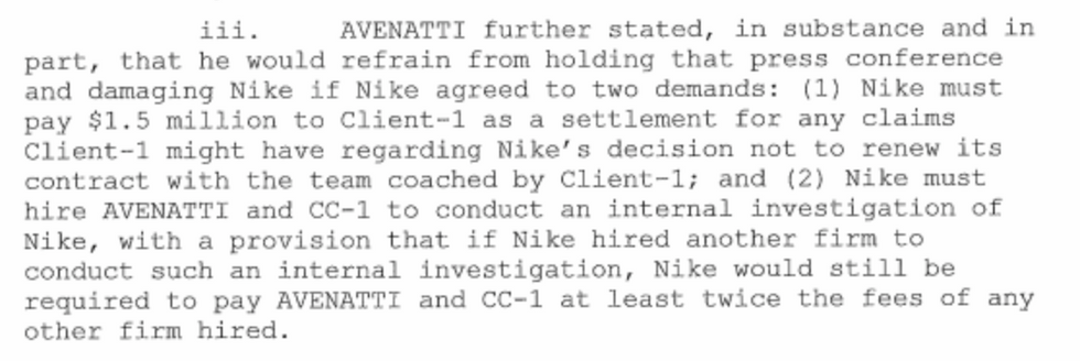 Here's what happened: Michael Avenatti threatened Nike, saying if Nike didn't pay up, Avenatti would go through with the press conference (tweet above in all its glory), which would result in a market hit to Nike.