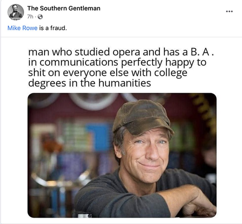 The hypothesis behind the meme is that Mike Rowe got a degree in something useless when he was twenty-two. And that now, at sixty, it is fraudulent for him to point out the scam college degrees have turned into almost forty years since he got one. By tagging Rowe in this post, TSG thought he was really going to stick it to him! Rowe was going to see that some random dude thought he was a fraud, and it was going to ruin his day.