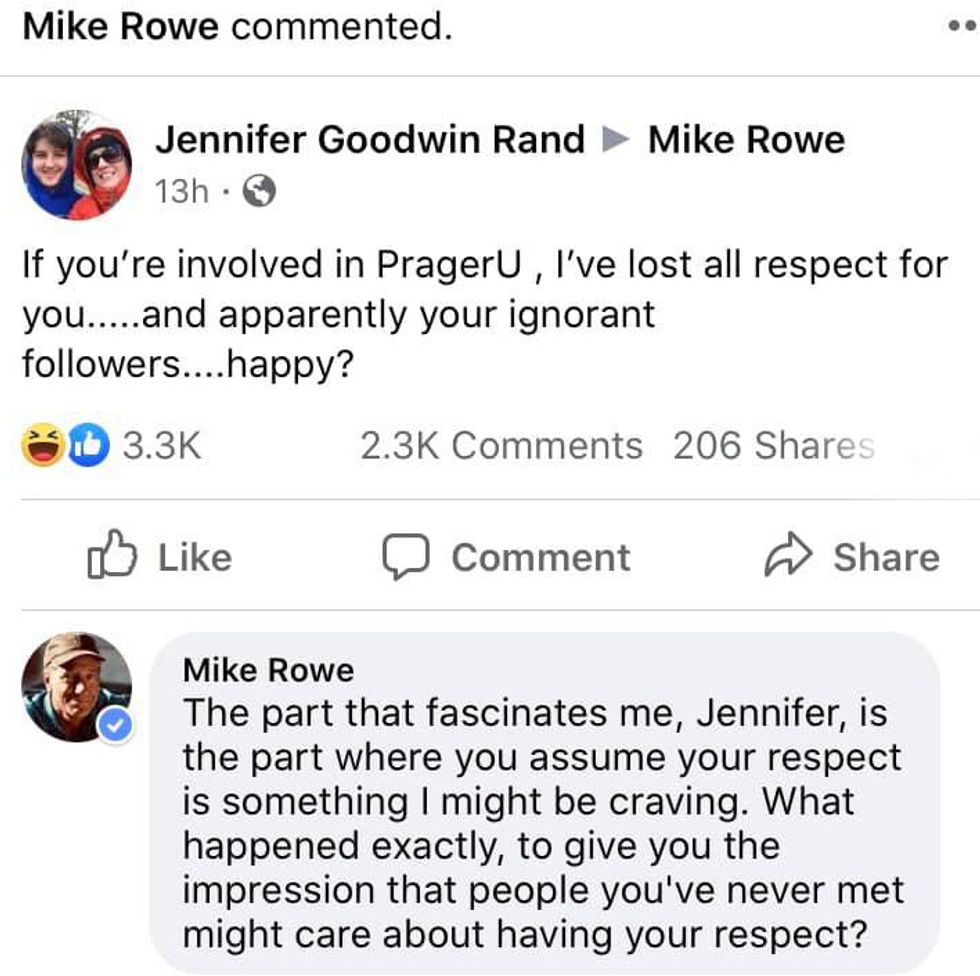 What's most funny here is that, as you see from this earlier screen capture from PragerU, this lady went back in to her post and added the part about Rowe's ignorant fans. A few thousand more comments later, I'm going to guess she switched off Facebook notifications.