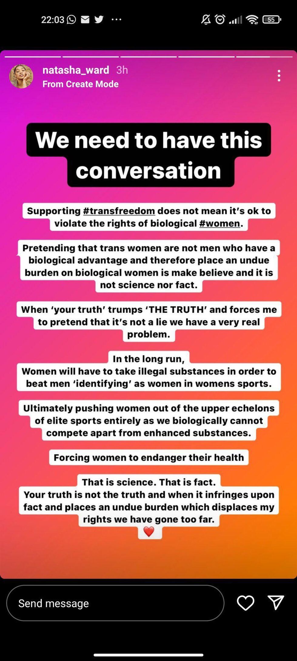 Ward spoke out on the debate about transgender athletes competing against biological women. You may have noticed the topic has been in the news. Here's what she had to say on an Instagram story. Not even a real Instagram post. A temporary one that's been screen-captured.