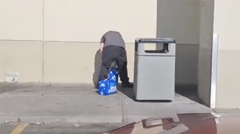 It was at this point that the employee realized, "Well f*ck, now I need to be seen carrying Bud Light." And quickly collected the stolen merchandise before some snapped a photo. Little did he know someone was sitting in their car remembering to do it for the content.