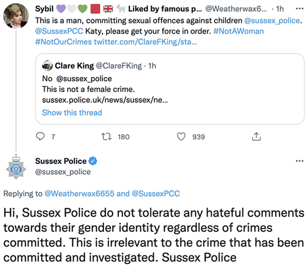 That tweet was deleted. I'm guessing it was when a grown-up showed up at work. Sussex police issued a statement saying that the tweet lashing out was inconsistent with their usual style of engagement. It went on to assure citizens that they are free to express themselves freely... but only within the boundaries of the law. And there are laws against misgendering. Yes, even child molesters.