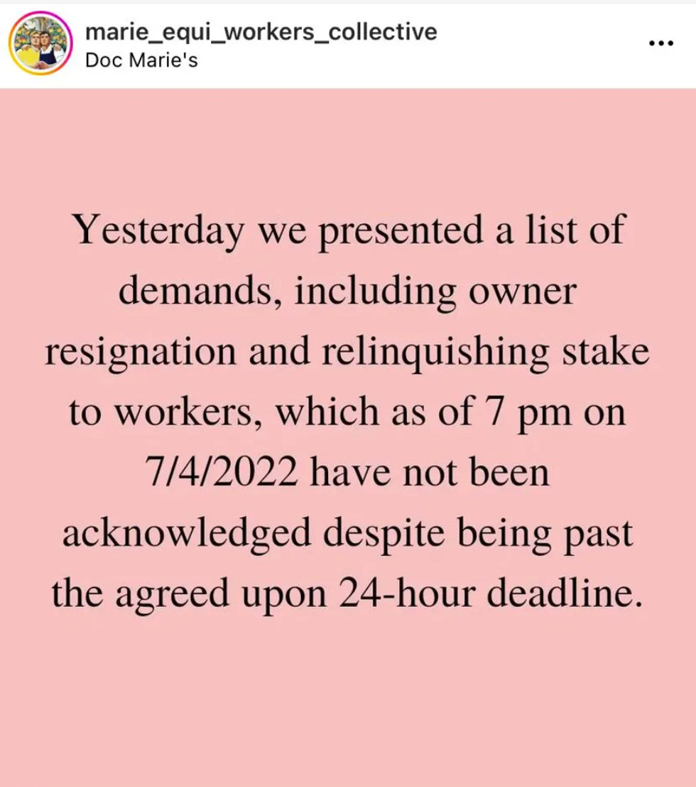 Yes, after being employed for five days. Doc Marie's was accused of, quote, not being "proactive enough in creating a safe space and accused the owners of racism." They also, in their list of demands--yes, a list of demands--wanted this small business that has only been open for five days to provide free education to the community.