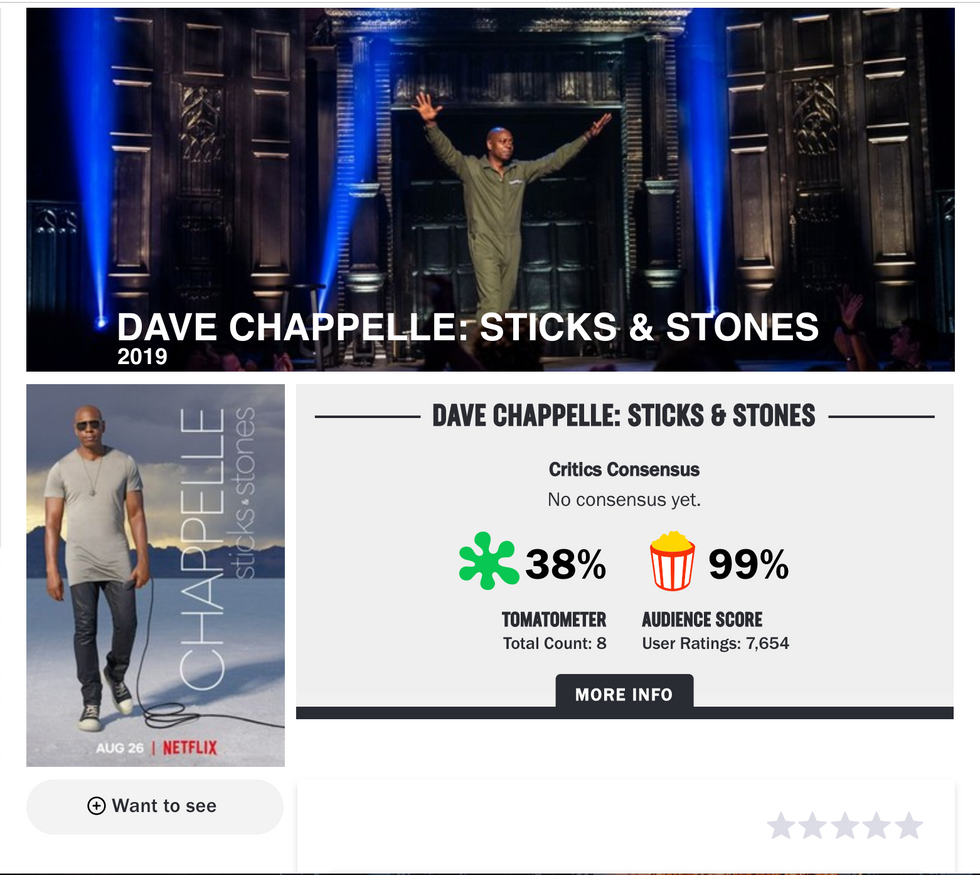 Dave Chappelle's "Sticks & Stones" takes aim at everyone. The rules of comedy are pretty simple: there are no rules. The comedian is free to mock everyone and everything, the audience is free to laugh or storm out offended. For the past few years, being offended has taken precedence over every other human quality, launching the offended into fake realms of importance. Hence Chappelle's comedy special of shoving two middle fingers in the air to the high and mighty is on the front lines on the battle for free speech. Perhaps hoping to squash the rise, movie and show review site Rotten Tomatoes hit hard on Chappelle's special. Paul Joseph Watson noticed the site hadn't allowed the audience to vote, where other sites had. Then this happened: