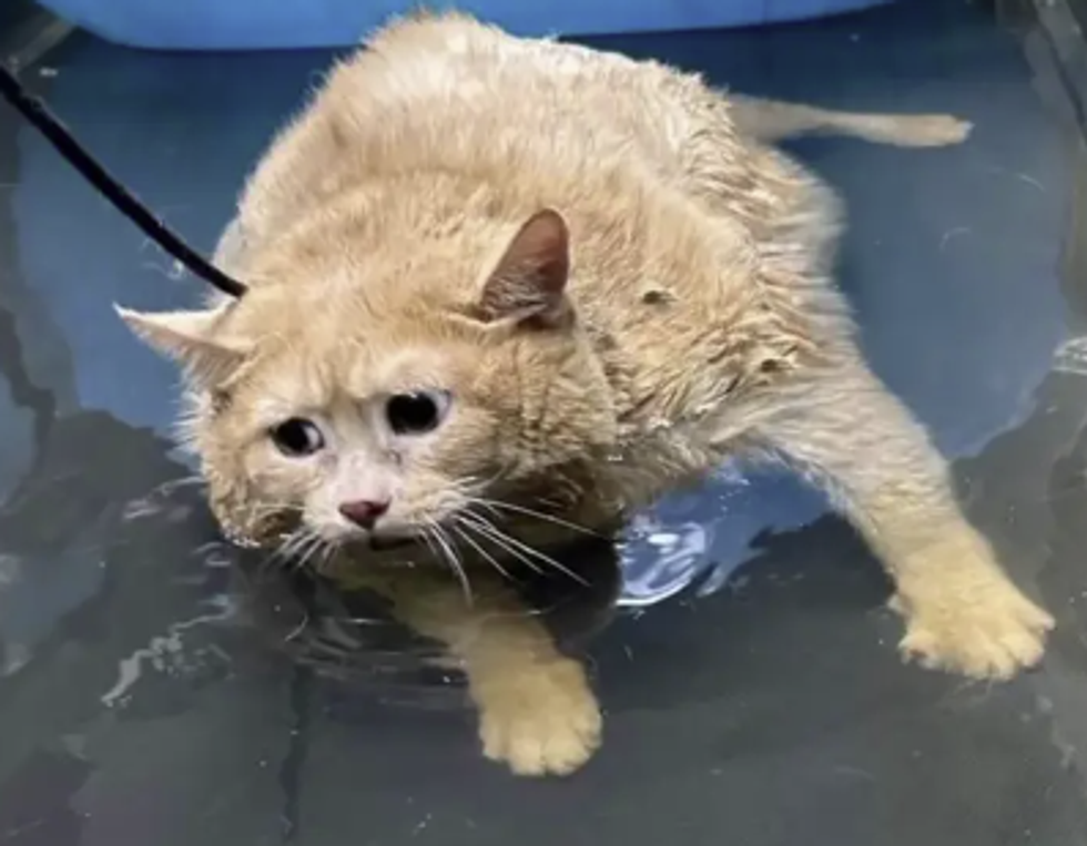 For the latter exercise, they put the puss in a water tank to lessen the strain on his joints, as seen in photos of him reluctantly walking on the subermeged contraption.
