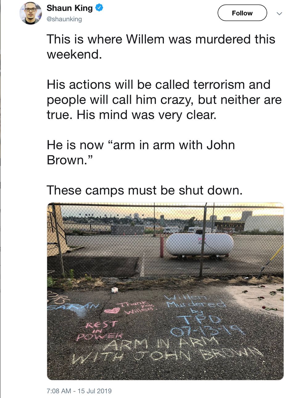 Black Lives Matter activist and Intercept columnist Shaun King praised an attempted domestic terror attack on Twitter yesterday, comparing the terrorist to abolitionist John Brown and saying that he was "the first martyr."In a Twitter thread, King compared Willem Van Spronsen, who was killed in a shootout outside an ICE detention facility, to John Brown, the pre-Civil War abolitionist. The 69-year-old Van Spronsen attacked the facility early Saturday morning, throwing incendiary devices and armed with a rifle. He lit one car on fire and attempted to blow up a propane tank before he was shot and killed by police.