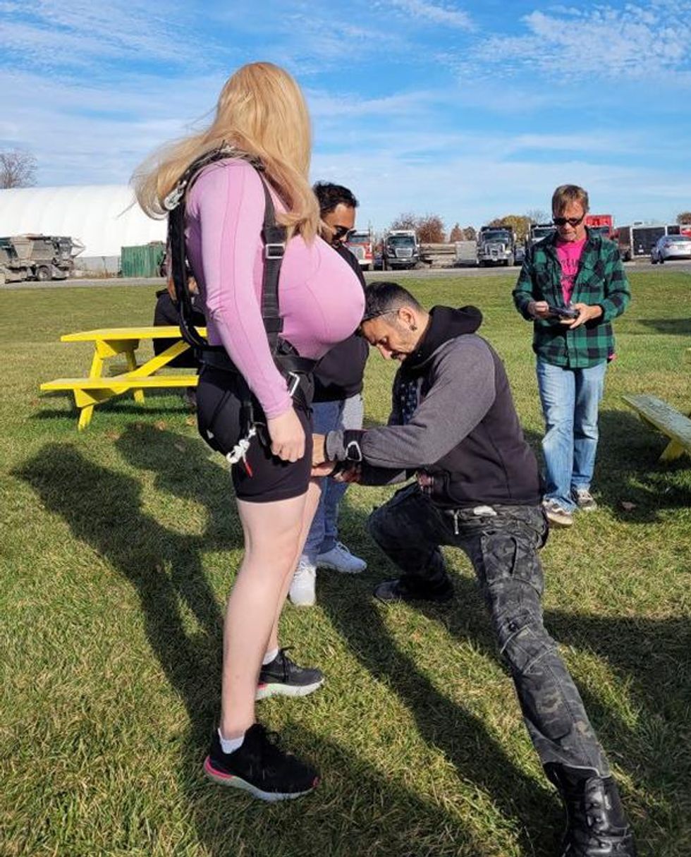 The professional skydivers took extra care to ensure all of Kayla was properly strapped in.