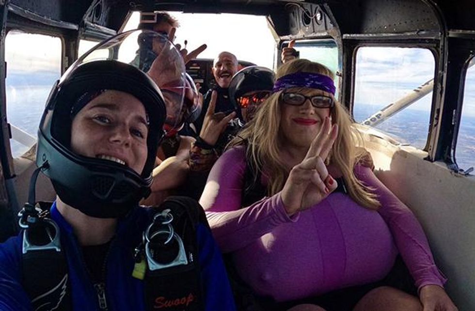 Our favorite beautiful and brave 'chesty' shop teacher goes skydiving, but not all of 'her' makes it