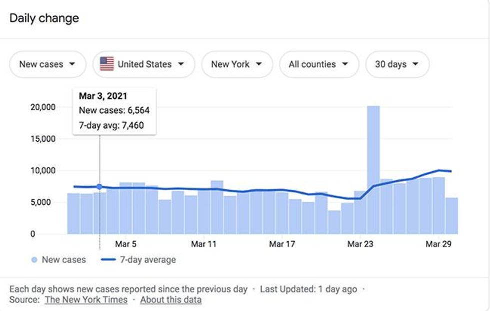 - In NY, new cases increased by 7% from March 3 to March 30.