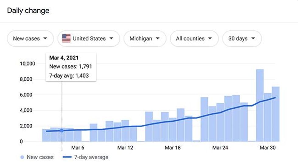 - In Michigan, new cases increased by nearly 300% from March 3 to March 30.