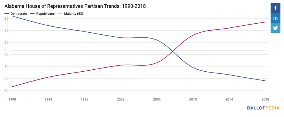 - For example, in 2010, Republicans won the House and Senate in Alabama for the first time in 136 years. SOURCE: AL.com