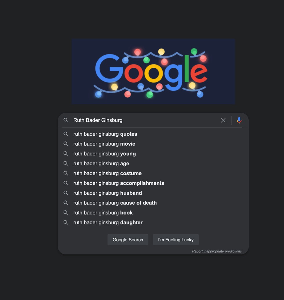 - When you type βRuth Bader Ginsburg Roe vβ into Google, it doesnβt autofill like it should and does for other things, like books and movies.