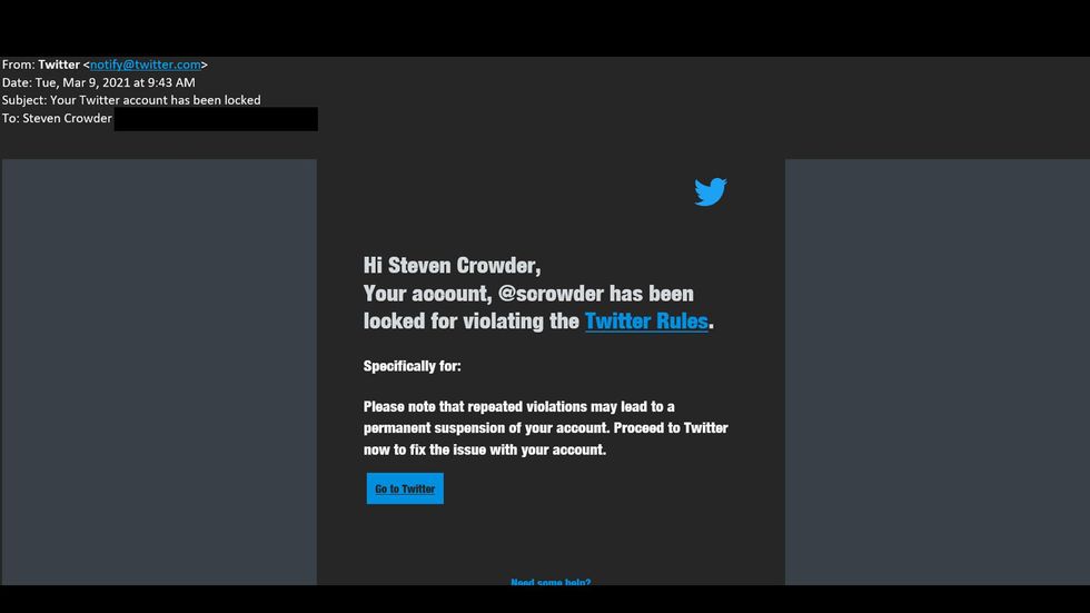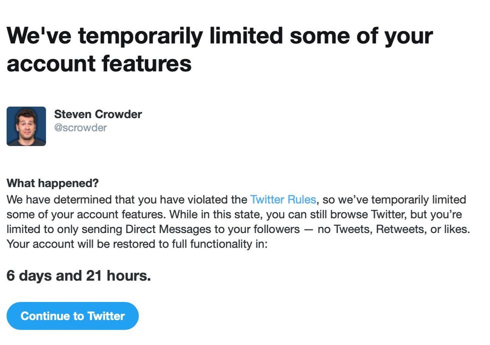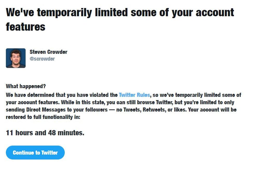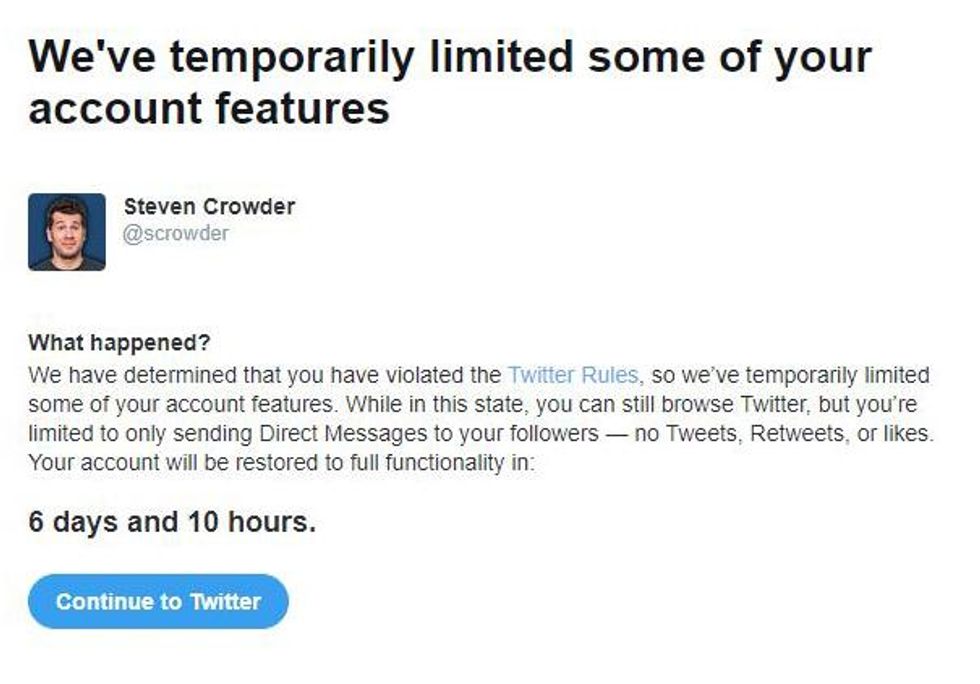 - On Tuesday while Crowder was live on air, he learned he was locked out of his Twitter account for 12 hours, and Twitter gave absolutely NO REASON why he was suspended.