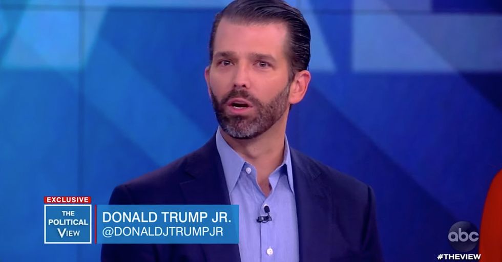 Donald Trump Jr. had a day of fun on The View. In addition to smacking Joy Behar for her blackface and Whoopi Goldberg for defending a rapist, he also nailed the ladies on their facts. That's when the ladies summoned their familiars to conjure Trump's testicles off for daring to share the whistleblower's name. Despite the whistleblower's name being reported days before, and all Don Jr. did was quote retweet. Watch as he not only defend himself, he goes on offense and brings up Epstein (who didn't kill himself):