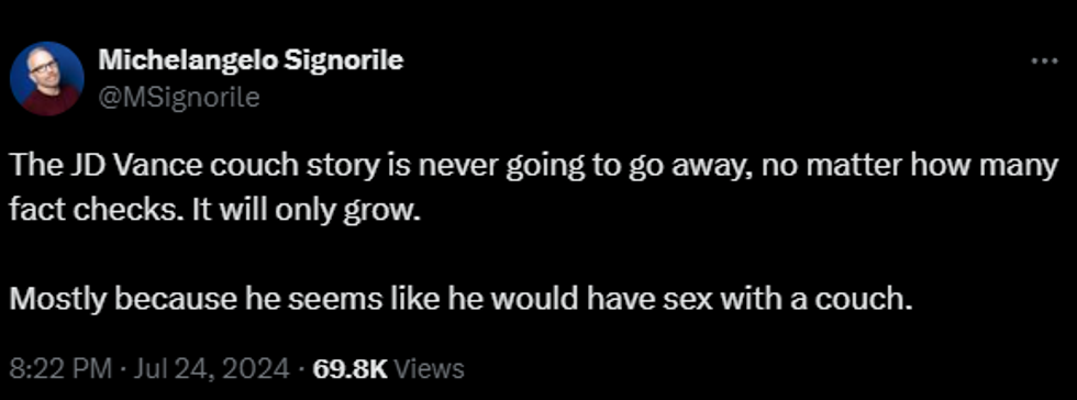 Attacking Vance's wife was a pretty awful opening salvo, another weird rumor circulating on the Interwebz was that Vance had sex with a couch.