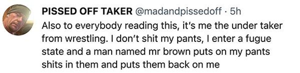 @Madandpissedoff was a parody account of The Undertaker -- not Mark Callaway, but the fictional sports entertainment character -- that, quote, "generally tweeted about The Undertaker shitting his pants and blaming it on an imaginary entity named Mr. Brown."