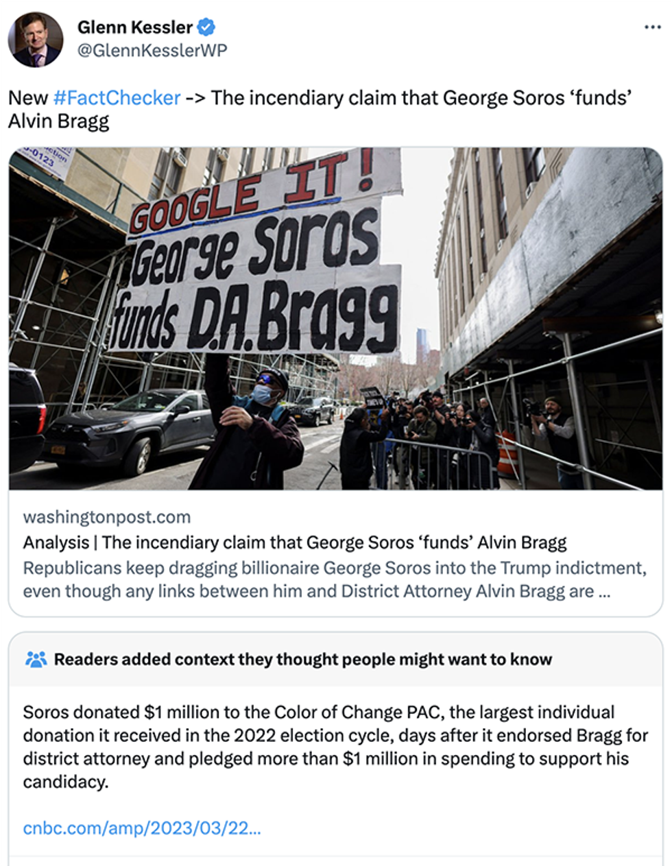 WaPo's "fact" checker got his orders with the claim Bragg isn't Soros funded. Community Notes to the rescue: "Soros donated $1 million to the Color of Change PAC, the largest individual donation it received in the 2022 election cycle, days after it endorsed Bragg for district attorney and pledged more than $1 million in spending to support his candidacy."