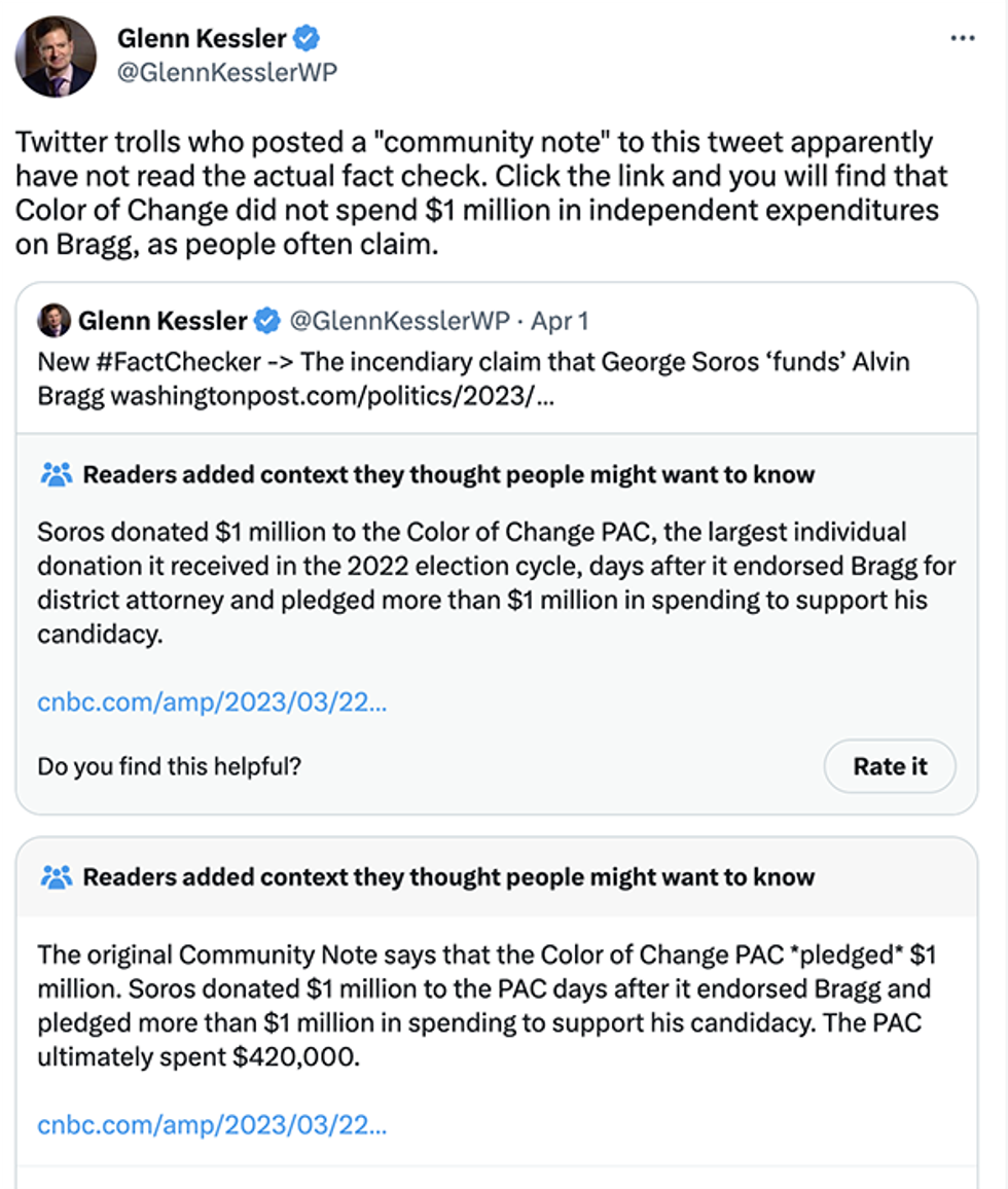 Then when Kessler ATTACKED "trolls" who hit him with a Community Notes, by claiming the Notes said something it didn't, the Notes struck back: "The original Community Note says that the Color of Change PAC *pledged* $1 million. Soros donated $1 million to the PAC days after it endorsed Bragg and pledged more than $1 million in spending to support his candidacy. The PAC ultimately spent $420,000."