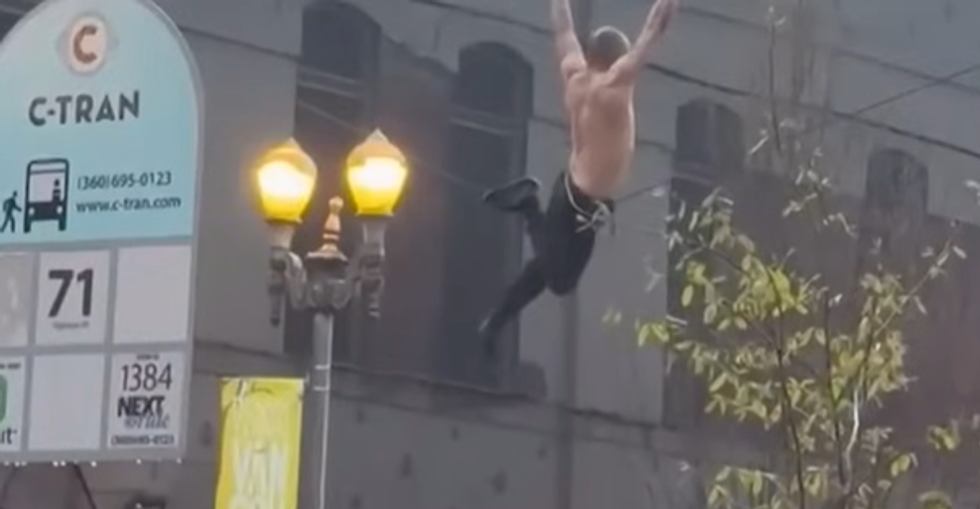 Eventually, the man lost his grip and was safely taken into custody. But I am not sure how he lost his shirt in the process.