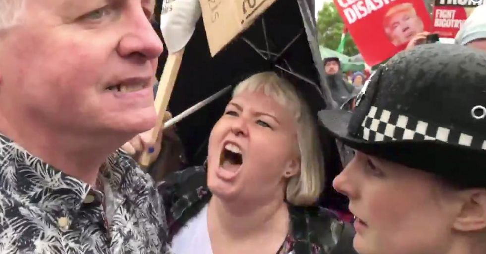 A few rabble-rousing limeys in the land of Shakespeare and the idea that mashed peas are somehow a condiment (no), got a little raw in the rump over a visit from their version of He Who Shall Not Named. But, as we well know from blokes like Nigel Farage, Daniel Hannan, Paul Joseph Watson, and this little movement called "Brexit," not all who live in the land of David Beckham's left foot are kool-aid swilling, buck-teethed twits. One such man walked amongst Britain's violent, rude, anti-Trump crowd and was, obviously, treated to a little of that trademark British politeness we often hear about... via loud taunts and a baptism via frothed dairy. Watch: