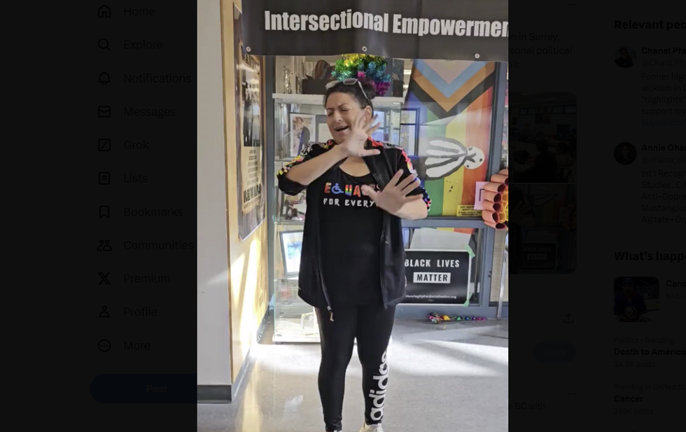 Ohana, who teaches at LA Matheson Secondary in Surrey, BC, caught the attention of former teacher Chanel Pfahl last month. Ohana is a law and social justice teacher, and head of her school’s “Indigenous department.” Pfahl describes in her X (formerly Twitter) bio that she “exposes wokism in Canadian schools.” She posted several photos of Ohana’s classroom, which is plastered with various pride and social justice flags or posters, including a “Don’t like looting? You will hate the British Museum” poster. There are also several flags that denote various sexual orientations or gender identities. A photo of Ohana shows her dressed in rainbow-adorned clothing with an “equality for everyone” shirt.